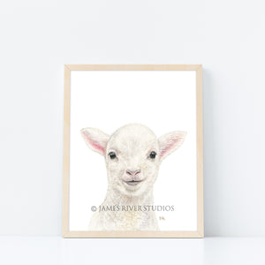 ORIGINAL SIGNED WATERCOLOR FINE ART PRINT: Lamb Portrait Fine Art Print (without frame) created from Our Beautifully Detailed Original Watercolor Painting. The endearing animal print is signed and dated by the artist on the back. Perfect for any age (child, baby, adult) and gender (girl or boy). Long lasting modern wall art for your baby's nursery, child's bedroom, kids' playroom, family room, or den.