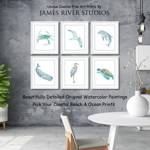 • ORIGINAL SIGNED WATERCOLOR FINE ART PRINTS: Unique set of 6 individual Coastal Beach Ocean Sea & Tropical Fine Art Prints (without frames or mats) created from Our Beautifully Detailed Original Watercolor Paintings: Crab, Dolphin, Whale, Sea Turtle, Seagull and Heron. Each print is signed and dated by the artist on the back. Perfect Modern Coastal Home Decor for your bedroom, living room, family room, or bathroom.