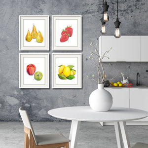 • ORIGINAL SIGNED WATERCOLOR FINE ART PRINTS: Unique set of 4 individual Fruit and Vegetable Fine Art Prints (without frames or mats) created from Our Beautifully Detailed Original Watercolor Paintings: Apples, Lemons, Pears and Strawberries. Each print is signed and dated by the artist on the back. Perfect Classic Modern Wall Art for Your Home Dining or Kitchen.