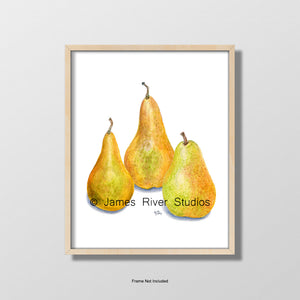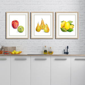 • ORIGINAL SIGNED WATERCOLOR FINE ART PRINTS: Unique set of 3 individual Fruit Fine Art Prints (without frames) created from Our Beautifully Detailed Original Watercolor Paintings: Apples, Lemons and Pears. Each print is signed and dated by the artist on the back. Perfect Classic Modern Wall Art for Your Home Dining Area or Kitchen.